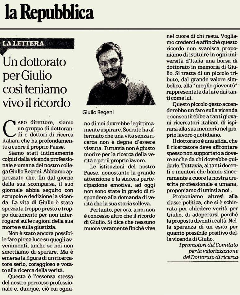 Una borsa per Regeni. A gennaio 2018, in occasione della commemorazione del rapimento e dell’uccisione del nostro collega e connazionale, su nostra proposta l’Università di Milano ha istituito una borsa di Dottorato intitolata a Giulio Regeni. Nelle settimane successive, diverse altre università italiane hanno fatto lo stesso.