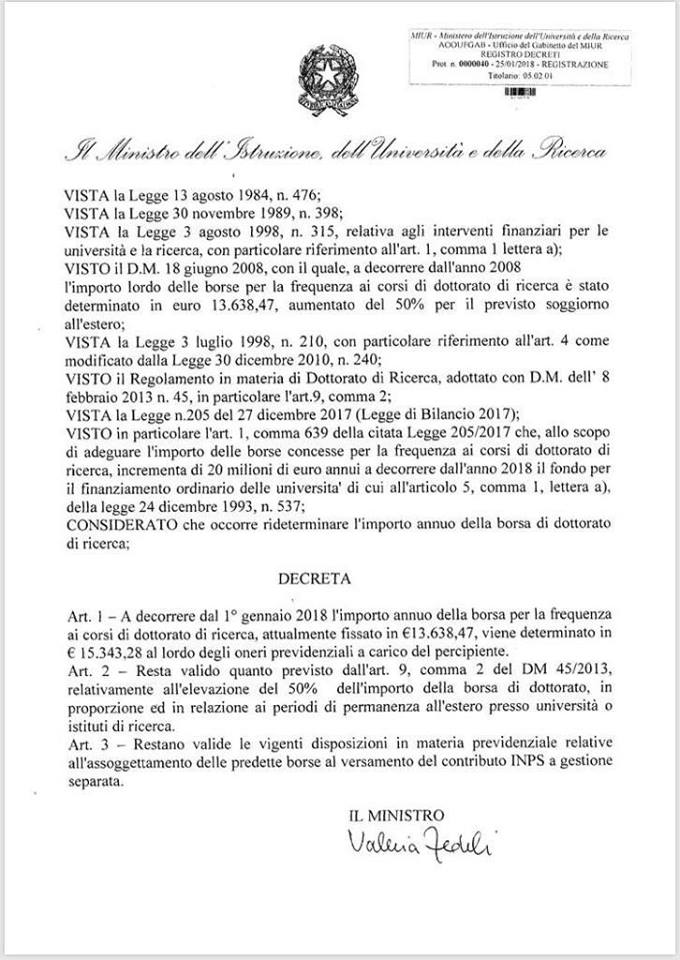 That victory has led, this year, to a national increase in the amount of all Italian PhD scholarships. The proposal was sustained in a decisive way by the Comitato per la valorizzazione del Dottorato, which I contributed to found.